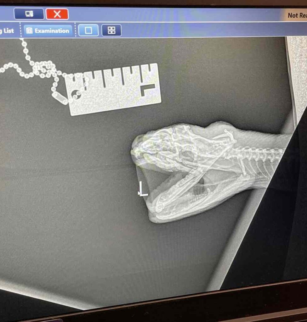 • Our vets saw a snake which was lethargic and had abdominal lumps. They used full-body x-ray to distinguish between retained eggs and obstructive material, so they could determine the best course of treatment.